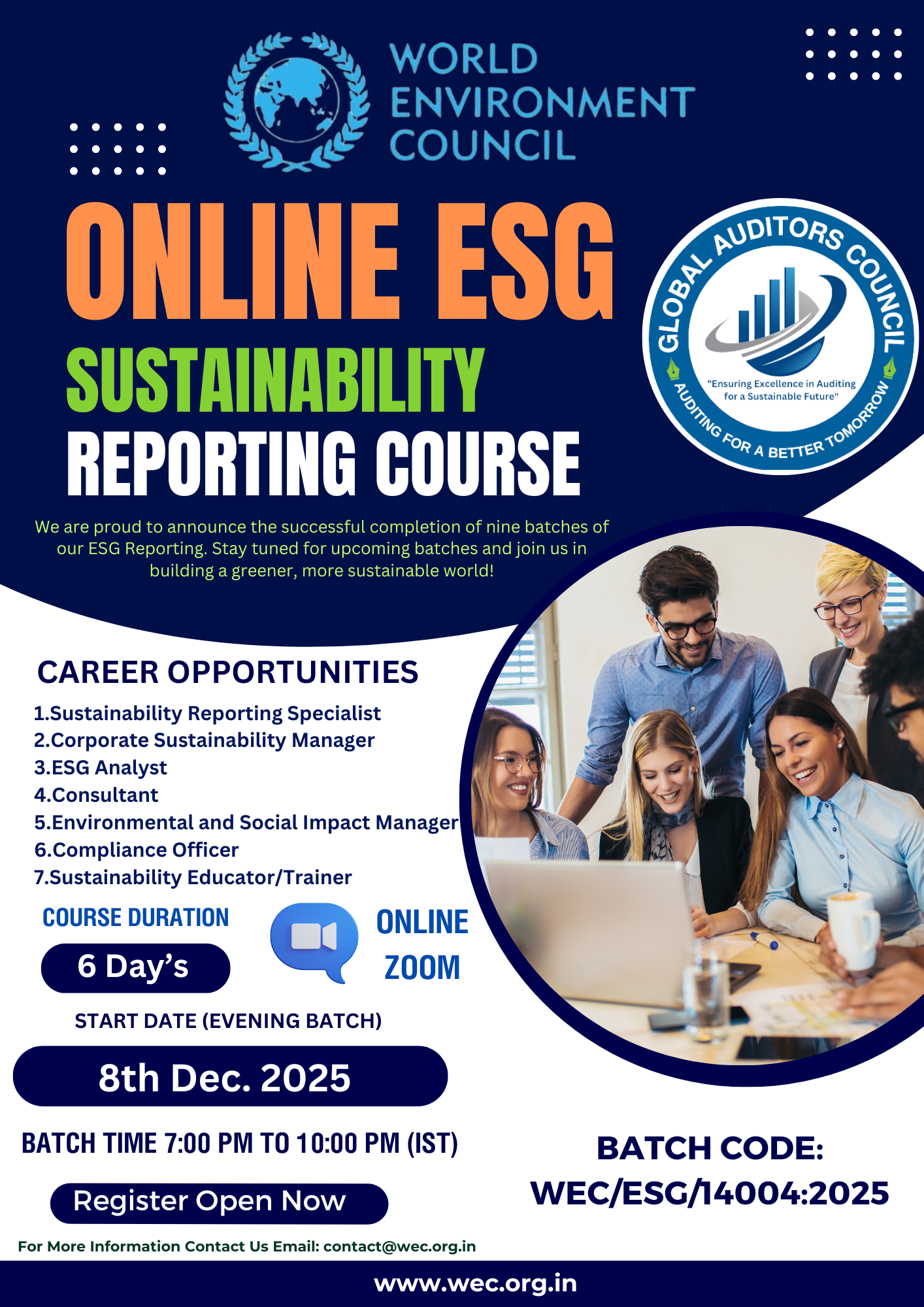 Welcome to courses.wec.org.in, the World Environment Council’s dedicated platform for transformative learning in Environmental, Social, and Governance (ESG) education. Led by Prof. Ganesh Channa, the Founder and President of the World Environment Council, we are proud to be pioneers in ESG Sustainability Reporting and Certified ESG Auditor training. Our courses are designed to equip professionals and students alike with the skills and knowledge needed to make a meaningful impact in sustainability and ESG practices. Certified ESG Sustainability Reporting and Certified ESG Auditor courses are carefully structured by a team of ESG experts to meet the growing global demand for transparency, accountability, and sustainability. Through multiple successful batches, we have received widespread international response, affirming our commitment to empowering individuals and organizations to drive sustainable change. Our Certified ESG Sustainability Reporting and Certified ESG Auditor courses are carefully structured by a team of ESG experts to meet the growing global demand for transparency, accountability, and sustainability. Through multiple successful batches, we have received widespread international response, affirming our commitment to empowering individuals and organizations to drive sustainable change. With a curriculum tailored to global ESG standards and delivered through flexible, accessible online and offline formats, courses.wec.org.in is your gateway to advancing in the ESG field and contributing to a sustainable future. Join us in shaping responsible business practices, fostering environmental stewardship, and championing social impact worldwide. World Environment Council – Building a Sustainable Tomorrow, Today.