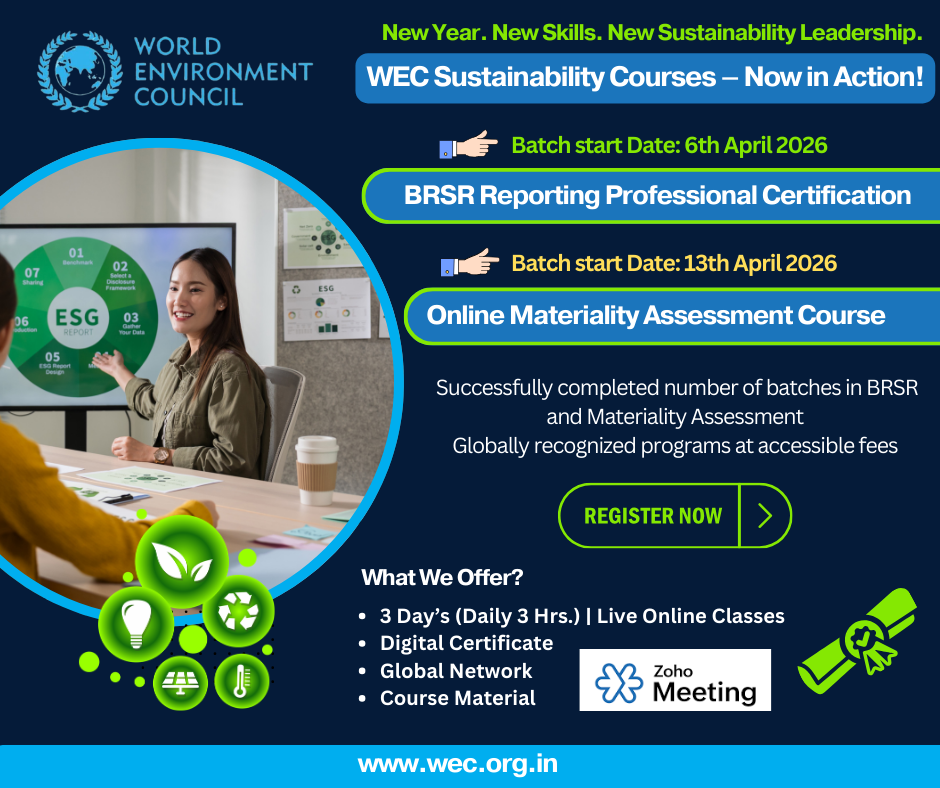 The World Environment Council (WEC) is proud to announce the launch of its upcoming globally recognized sustainability certification programs designed to build the next generation of ESG and sustainability leaders. ๐ ๐จ๐ฝ๐ฐ๐ผ๐บ๐ถ๐ป๐ด ๐๐ผ๐๐ฟ๐๐ฒ๐: ๐น ๐๐ฅ๐ฆ๐ฅ ๐ฅ๐ฒ๐ฝ๐ผ๐ฟ๐๐ถ๐ป๐ด ๐ฃ๐ฟ๐ผ๐ณ๐ฒ๐๐๐ถ๐ผ๐ป๐ฎ๐น ๐๐ฒ๐ฟ๐๐ถ๐ณ๐ถ๐ฐ๐ฎ๐๐ถ๐ผ๐ป ๐ ๐๐ฎ๐๐ฐ๐ต ๐ฆ๐๐ฎ๐ฟ๐: 13๐๐ต ๐๐ฝ๐ฟ๐ถ๐น ๐ฎ๐ฌ๐ฎ๐ฒ Following the successful completion of multiple batches in BRSR and Materiality Assessment, WEC continues to deliver high-impact, practical learning programs at accessible fees.